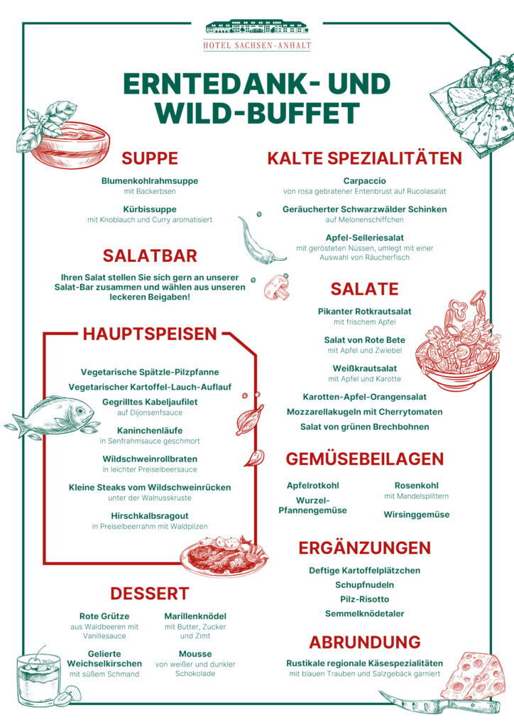 Am Sonntag, den 05.10.2025 ab 12:00 Uhr haben wir ein leckeres Erntedank- & Wild-Buffet zum Preis von € 34,90 pro Person (Kinderregelung vorhanden) für Euch vorbereitet. Einen ersten Vorgeschmack findet ihr hier bereits jetzt. Reservierungen nehmen wir ab sofort entgegen.