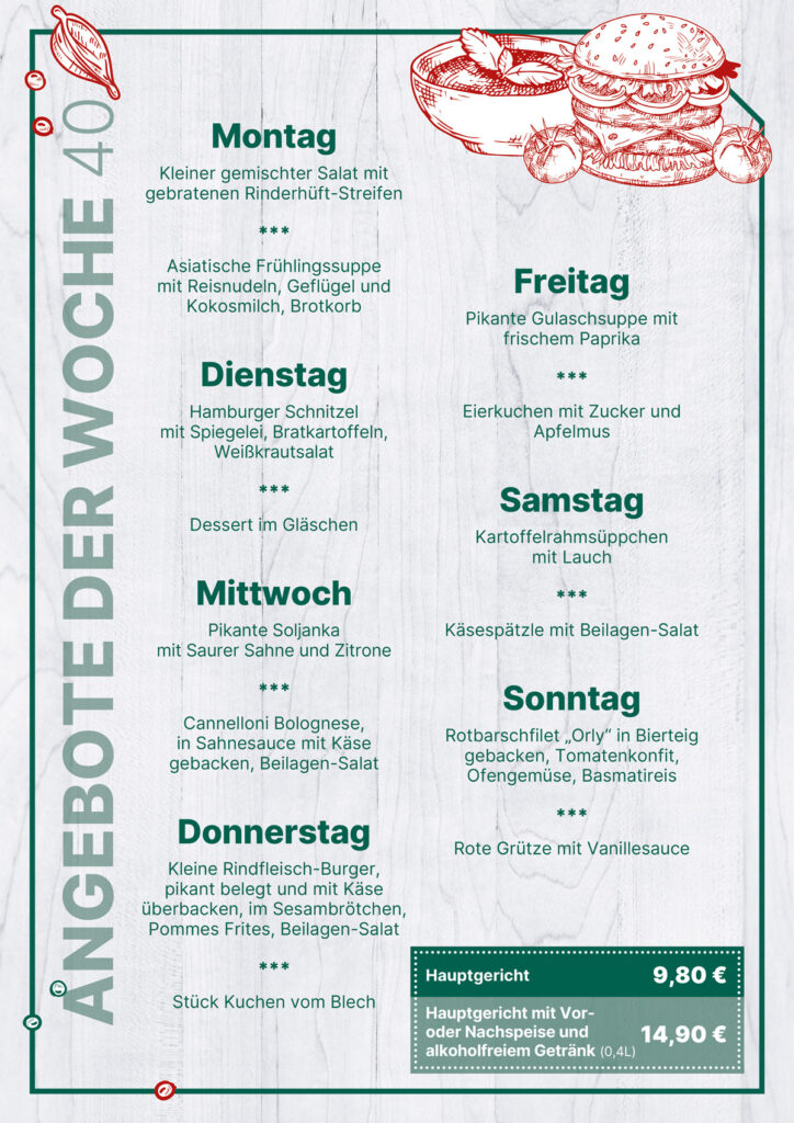 Genießen Sie das Angebot unseres Küchenchefs begleitet von einem frisch gezapften Bier oder einem Glas Wein in freundlicher Atmosphäre.