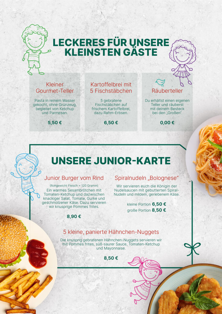 Unsere kleinsten Gäste gehen natürlich nicht leer aus bei uns. Folgende leckere Speisen bieten wir für Euch in unserem Restaurant an: